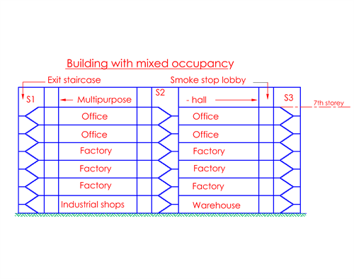 Where different parts of a building or storey of a building are designed for different types of occupancies or used for different purposes at the same time, the exit requirements of the entire building or storey of the building shall be determined on the basis of that type of occupancy or usage having the strictest exit requirements or the exit requirements for each building section shall be determined separately.