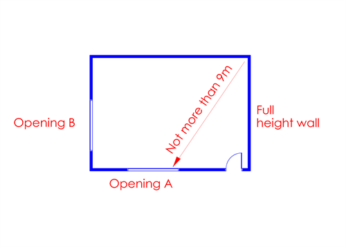 b. No part of the floor space shall be more than 12m from the openings on the perimeter walls of the building or air well. Air well where provided for this purpose shall have a superficial plan area of not less than 10m², or 0.1m² for every 300mm of height, whichever is greater, and have a minimum dimension on plan of 2m, open vertically to the sky for its full height.