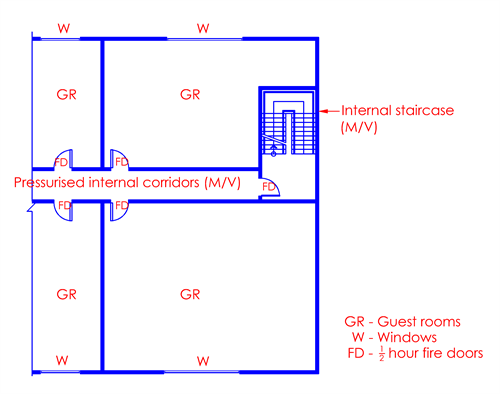Provision of pressurisation to the internal corridor would help to check the migration of smoke from any of the guest rooms. The pressure gradient shall be such that :P1>P2>P3
