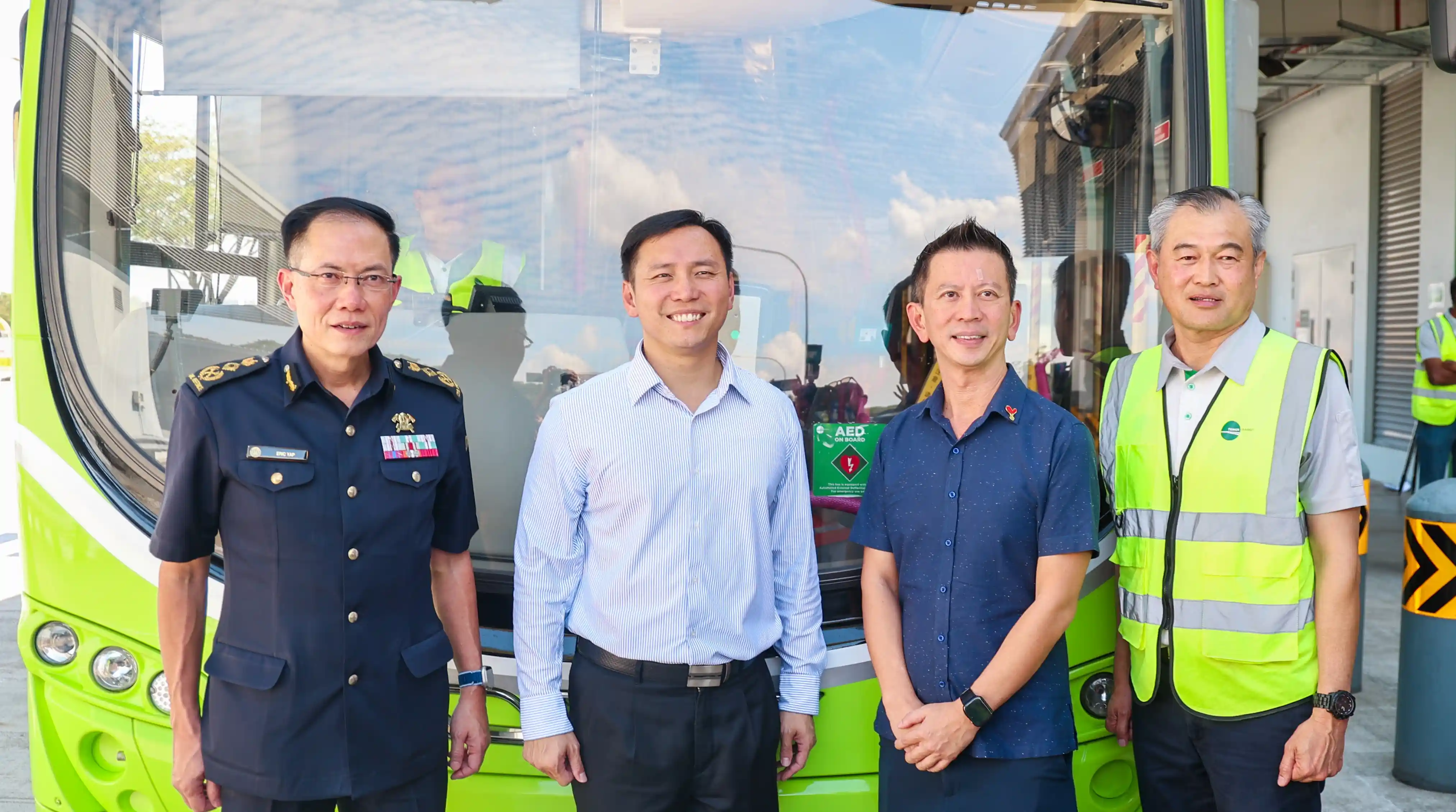 (From left) Mr Lim Tien Hock, Chief Executive Officer (Bus Business), SBS Transit; Mr Geoffrey Ong, Chief Executive Officer, Singapore Heart Foundation; Associate Professor Muhammad Faishal Ibrahim, Minister of State, Ministry of Home Affairs and Ministry of National Development; COMR Eric Yap, Commissioner SCDF, at the launch of the AED-on-Buses Programme on 8 November 2024. PHOTO: SCDF