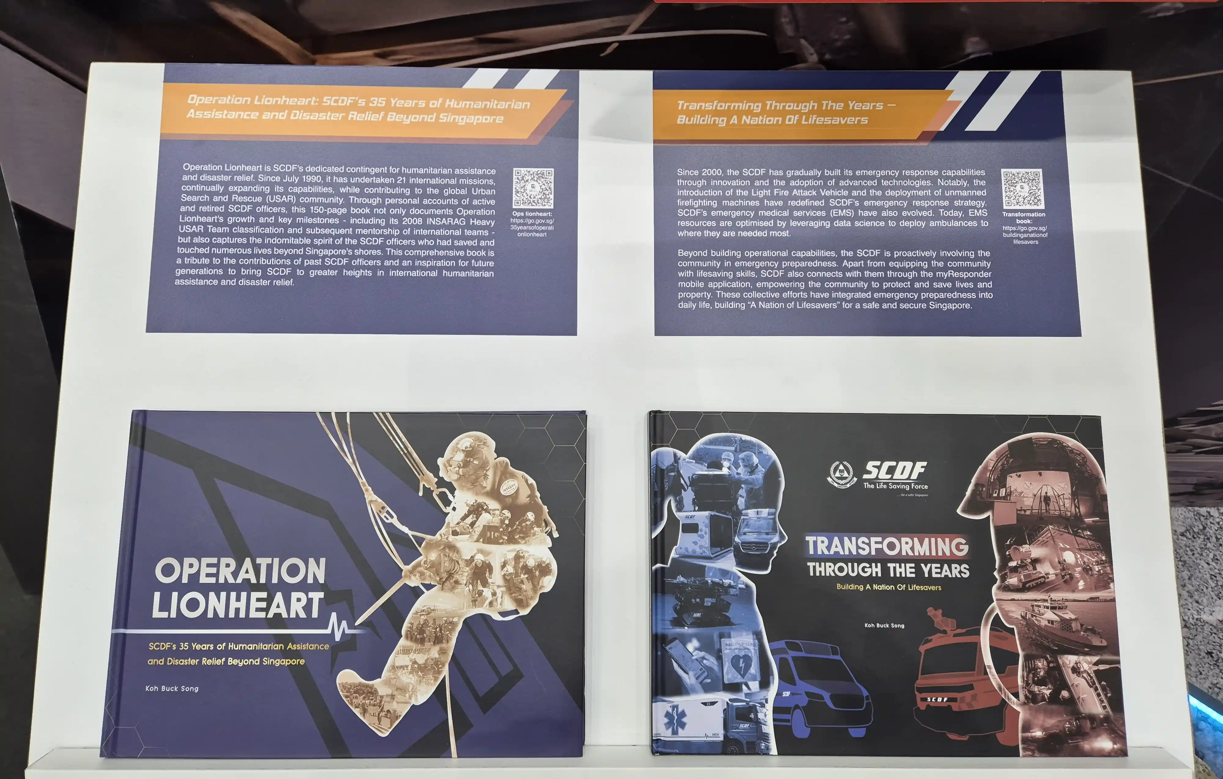 SCDF’s commemorative books on the 35 years of Operation Lionheart (left) and SCDF’s Transformation were displayed at SIDEX for public reading. PHOTO: SCDF