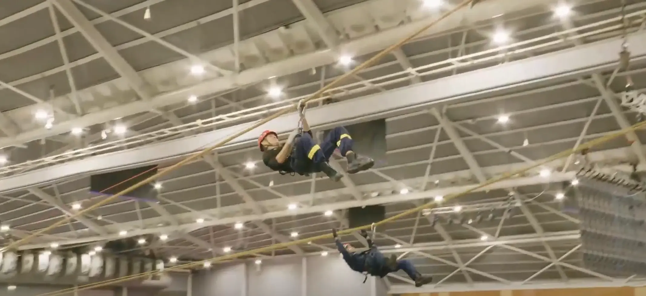 In the final stretch of the Braveheart Challenge, SGT3 Zayyani (back) and Le Van Dung (front) from the Vietnam Police Department of Fire and Rescue were neck-and-neck as they traversed down a manila hemp rope. PHOTO: SCDF