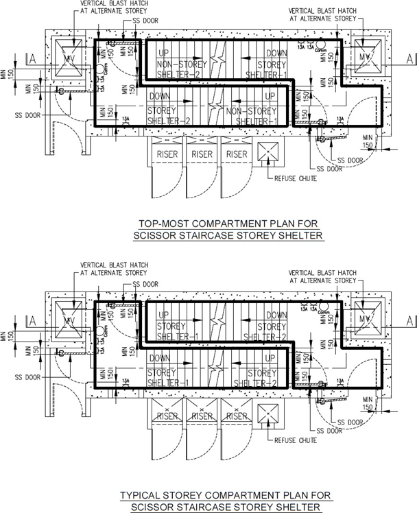 b. Scissor S/C SS comprises two SS at each storey. Each SS compartment shall be made up of one entrance SS door and 2 internal SS doors. Refer to FIGURE 2.12.2(j) and 2.12.2(k). Signage shall be provided adjacent to each SS door entrance showing the designated dwelling units assigned to each shelter compartment.