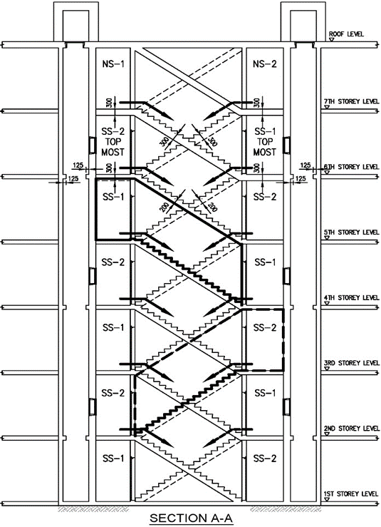 a. Inside the S/C SS, there has to be a continuous reinforced concrete internal wall of minimum 200mm thickness running through the full height of the S/C SS tower. At every storey, one internal SS door swinging in the direction of exit travel, with removable door kerb, is to be provided either at the staircase entrance landing or at the intermediate landing. Refer to FIGURE 2.12.1(f), 2.12.2(b), 2.12.2(j) and 2.12.2(k). The SS door clear opening dimensions shall be: