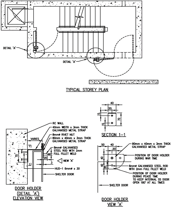 a. At every storey, one SS door with removable door kerb, is to be provided at the shelter entrance and shall be kept in the open position during peacetime. Refer to FIGURE 2.12.2(b), 2.12.2(d) to 2.12.2(k). A door holder shall be provided to hold the internal SS door in open position. Refer to FIGURE 2.12.2(l). As this SS door swing against the direction of exit travel, it shall be not doubled up as the peacetime fire-rated door.