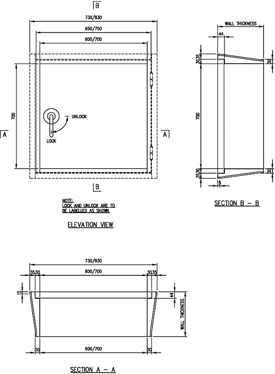 d. The net clear opening of the vertical and horizontal blast hatches shall be 600/700mm x 700mm as shown in FIGURE 2.12.7(a) and 2.12.7(b).