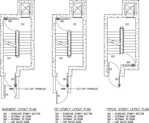 a. S/C SS comprises one SS compartment each storey. Each shelter compartment shall be made up of one entrance SS door and 2 internal SS doors, i.e. one at each intermediate landing or main landing. Refer to FIGURE 2.12.1(f) and 2.12.2(b). For fire discharge level, refer to FIGURE 2.12.2(f) to 2.12.2(h).