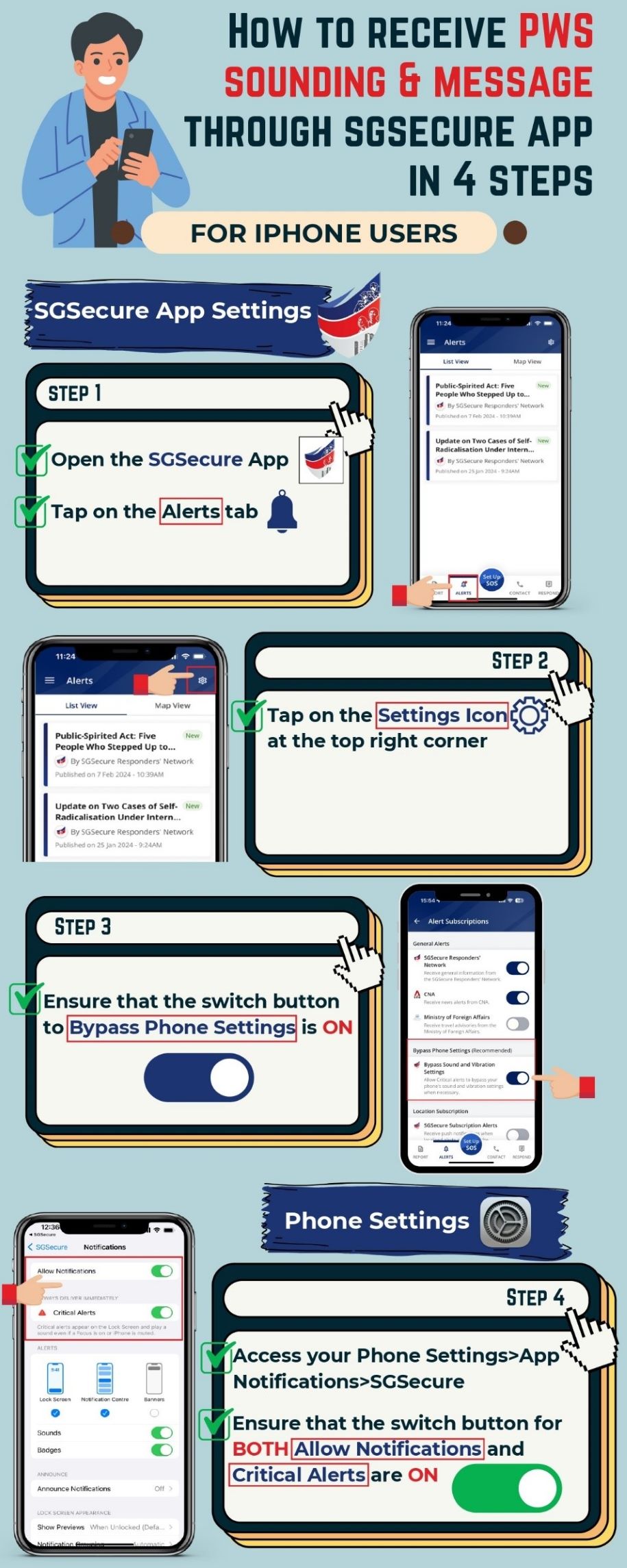 The signal will also sound for 20 seconds on all smartphones that have the SGSecure mobile app. This will be accompanied by a brief text message on the PWS sounding. To receive the signal and the text message, the app's notification and alert settings must be enabled.